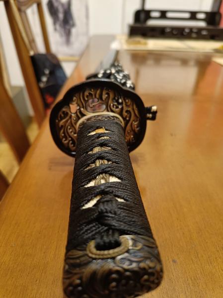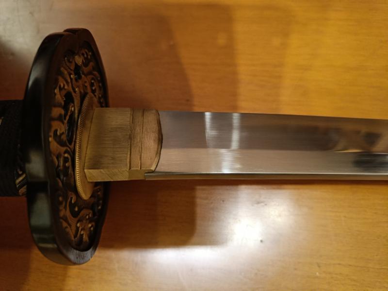 AVISO : La hoja de la katana tiene un pequeño defecto estético en una de sus caras. Se me ocurrió la estupidez de intentar pulirla para darle mas brillo con pasta de pulir y un disco de pulidora pero tuve que parar por que no me gustaba el resultado. Se aprecia perfectamente en una de las fotos.