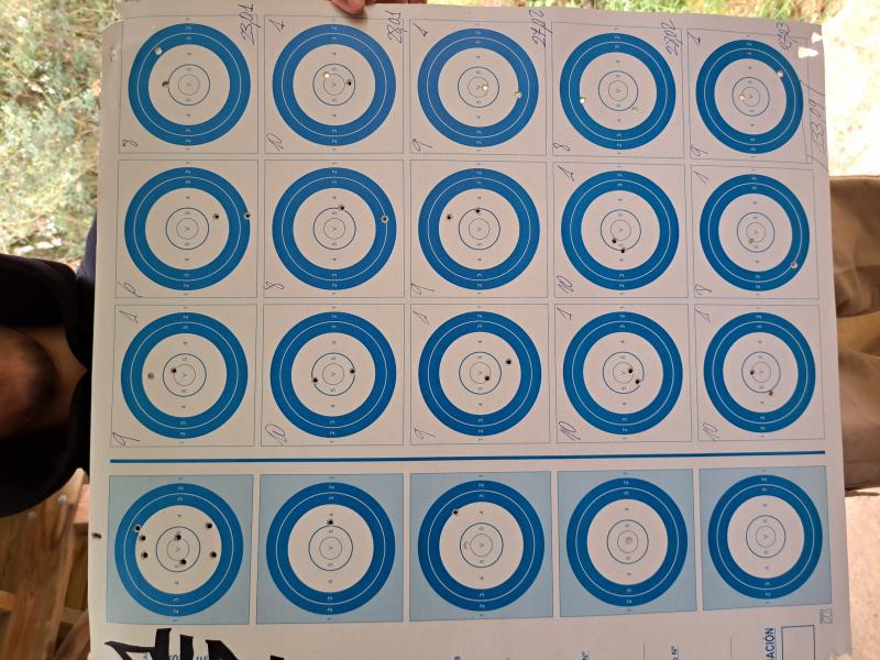 Una diana para pasar el rato, afinando el visor, sin mayores pretensiones, con la carabina estrictamente de serie, y su famoso disparador bastante duro, afinado lo mejor posible. Luego le cambie el muelle del disparador, por el canadiense Yodave, que salió la coña por unos 30 euros, y al final, no es mas que el muelle de un boli, y aun mejoro un pelin la agrupación. Los tiros a los parches, van sin orden ni concierto, pero da una idea de que es capaz de agrupar en alrededor de 10 mm. con munición de a 5 € caja.