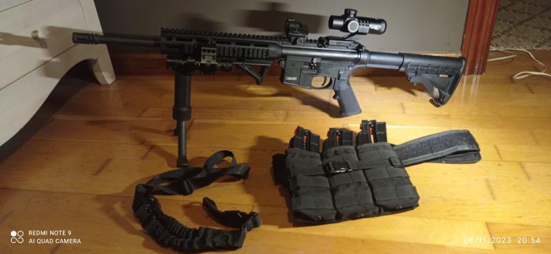 Con 3 cargadores de 25 cartuchos, cinturón con portacargadores. Óptica con retícula iluminable, punto rojo a 45°, linterna a 45º, soporte para enganche de correa, correa de un punto, suplementos picattiny, 2 grips, uno de ellos despliega bípode y funda de transporte. Habré disparado 300/400cartuchos, dos entrenos y una competicion. Con factura de abril de este año. Precio 825€. Asturias.