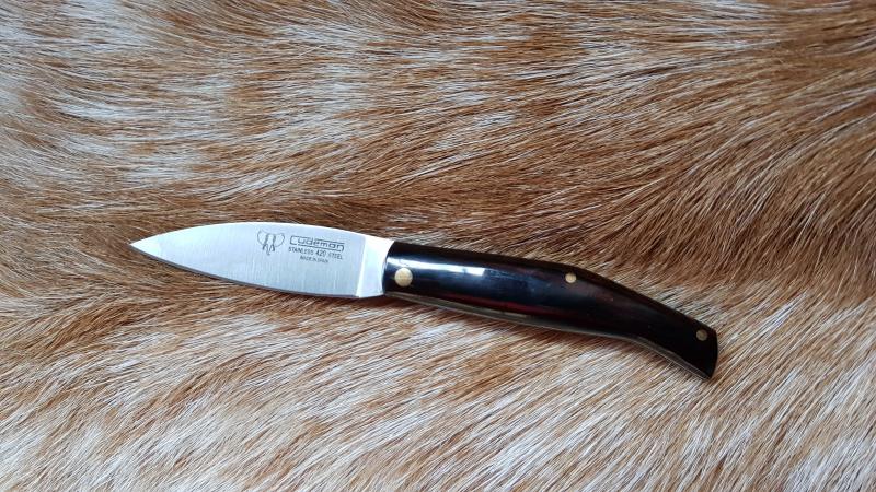 Barbero Albaceteña 2 - VENDIDA - Precio original 85, cachas de carnero blanco, negro y naranja con pin decorativo, hoja muy afilada, una navaja pequeña para portar fácilmente y llevando siempre exclusividad y trabajo artesano en el bolsillo