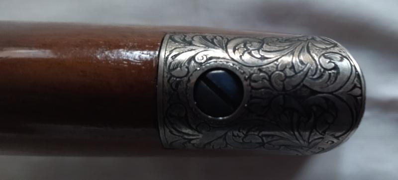 Profusamente grabado tanto báscula, cañón, contera y cantonera. Motivos mejicanos muy originales, bañado en color plata y oro, ligeramente desgastado en rabera superior.