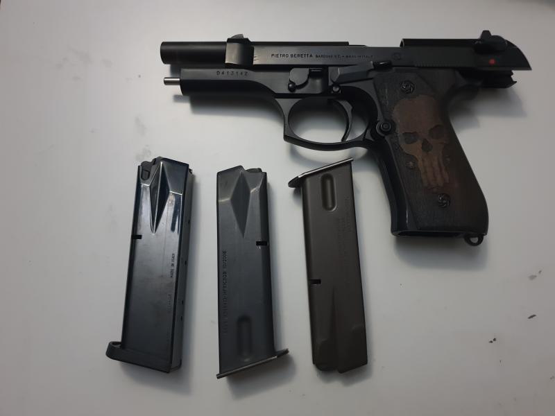 Vendo Beretta 92 F pavonada en negro con maletín original reforzado (Le he puesto bisagra y cierres de acero), tres cargadores (Uno de ellos con taconera) y tres juegos de cachas (La original, otra rayada tipo cebra en blanco y gris y la de la calavera del "Castigador" tallada en madera).