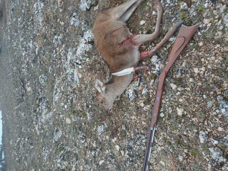 Conseguí esta cierva con el hawken a 60 metros,al final de la tarde después de estar recechando todo el día,le pegue centrado pero no en el hombro y empezó andar y no me daba tiempo a cargar de nuevo y la perdí de vista,y no daba sangre,cuando pensaba ya que la había perdido y me estaba llamandome a mi mismo idiota por no recargar más rápido mientras iba a ver el lugar donde le había pegado el tiro ,me la encontré allí , increíble se había dado la vuelta y se había tumbado.