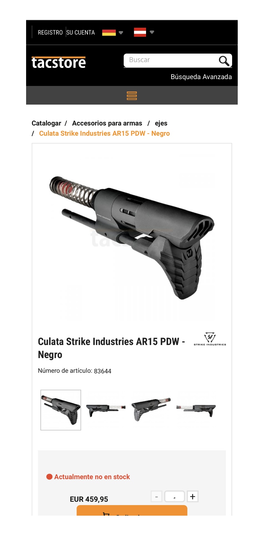 -Culata minimalista + muelle de fleje con buffer Strike Industries PDW. Me costó 472 €. En www.tacstore.com la tuvieron luego por 459’96 €, pero ahora ni la tienen en stock.