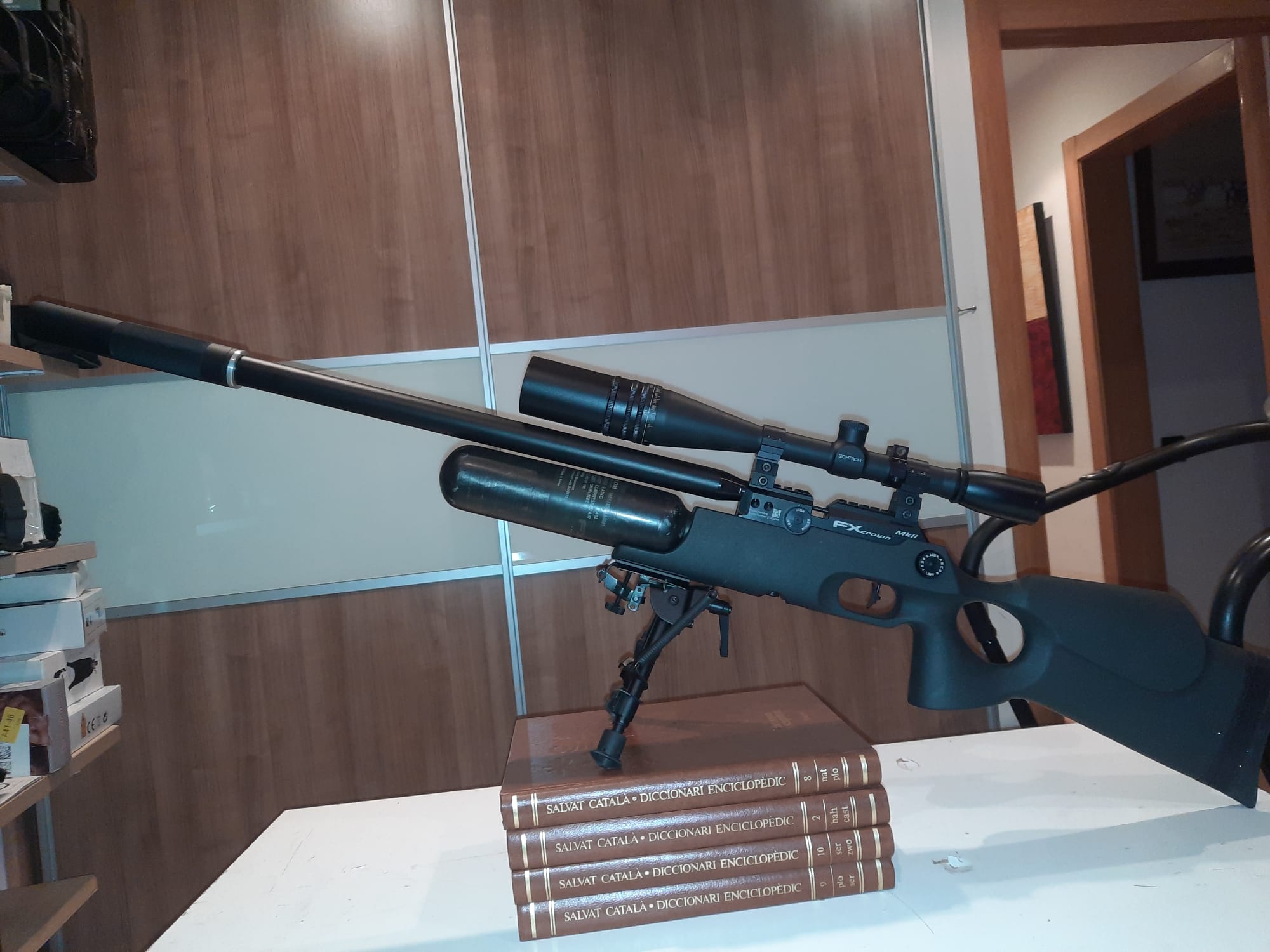 Una carabina FX Crow, incluye bípode y silenciador. Precio 1150€ .Se adjunta el visor Sightron SII de 300€. Tanto la carabina como el visor comprados nuevos.
