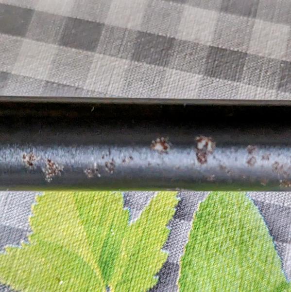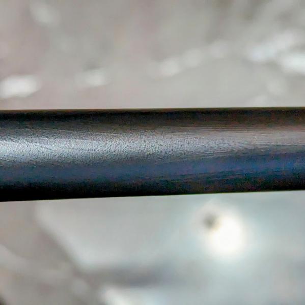 Se trata de una carabina que, tras haber estado un tiempo mal cuidada en una intervención de armas, presentaba bastante deterioro en el cañón. No soy profesional ni nada y la he reparado como buenamente he podido: primero le di con estropajo normal de cocina para eliminar el oxido superficial que había. Después apliqué un líquido de la empresa Jenolite que convierte el oxido restante en pavón. Y, por último, tres o cuatro capas de pintura Montana. Entre el Jenolite y la Montana creo que habría que haber dado otra vez con el estropajo para igualar toda la superficie.