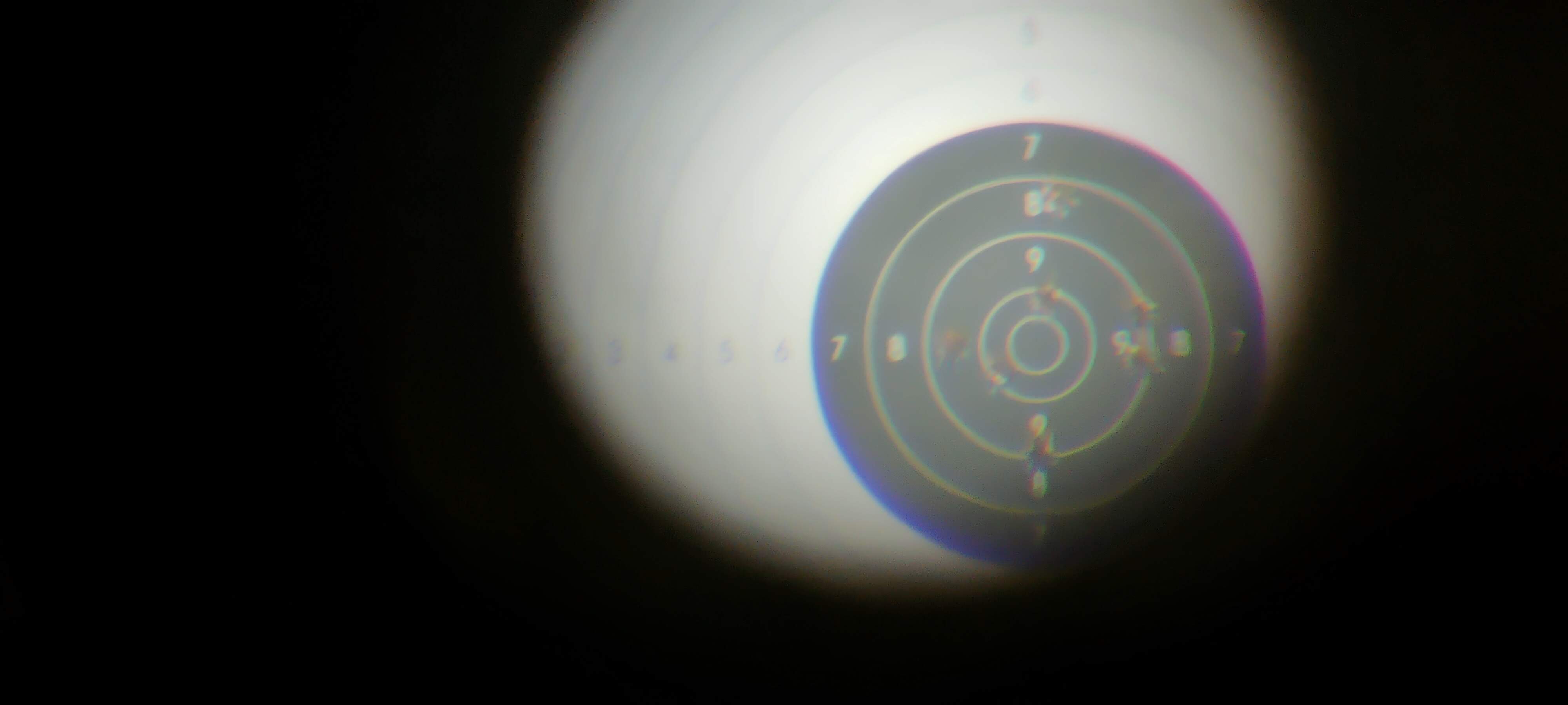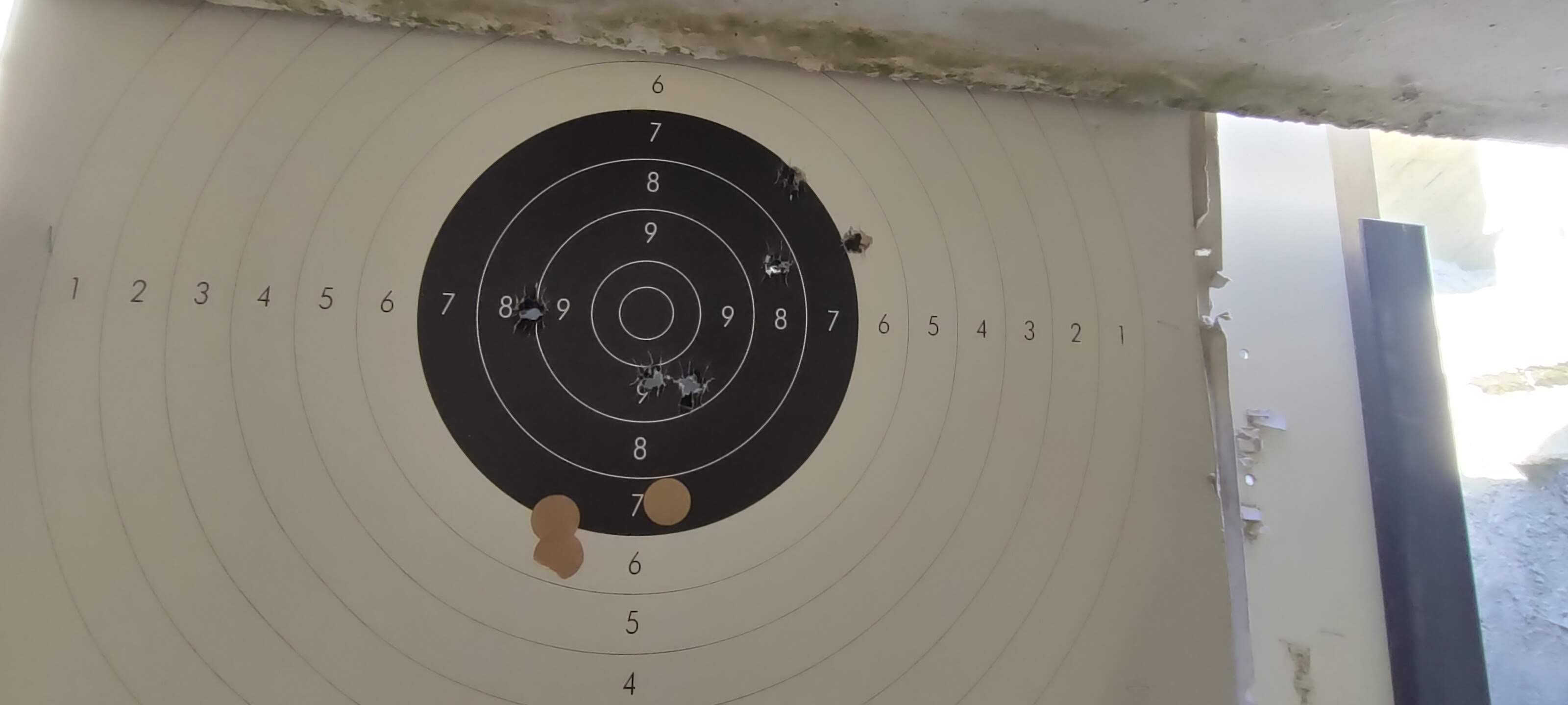 Al final tire 10 cartuchos, de los cuales 2 fueron con el de dos bandas y el resto con el de tres, en la diana solo se ven los impactos del de tres bandas (dos agujeros parcheados que tire a 25 metros primero, el resto ya a 50 metros)