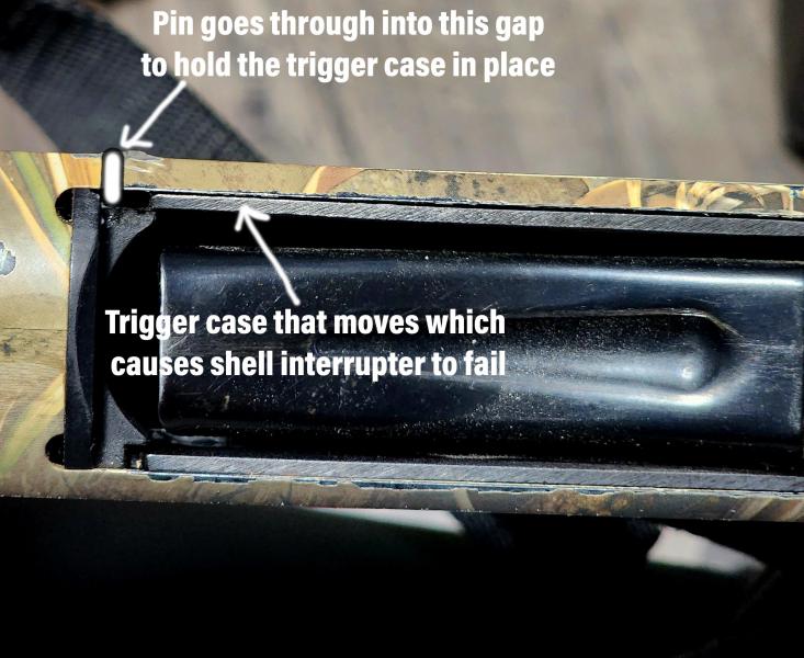 Fallo #2: todas las SXP, nuevas o antiguas tienen una pieza tubular en la boca del cargador, de polímero. Vale, a X disparos se resquebraja y se deshace, lo que hace imposible subir el cartucho del cargador a la recámara. No sé por que Winchester le mete esa pieza a todas las escopetas semimodernas y modernas, es un estorbo y no pinta nada. Con hacer el tubo cargador de una pieza completa metálica como en el 99% de las escopetas, lo solucionarían.