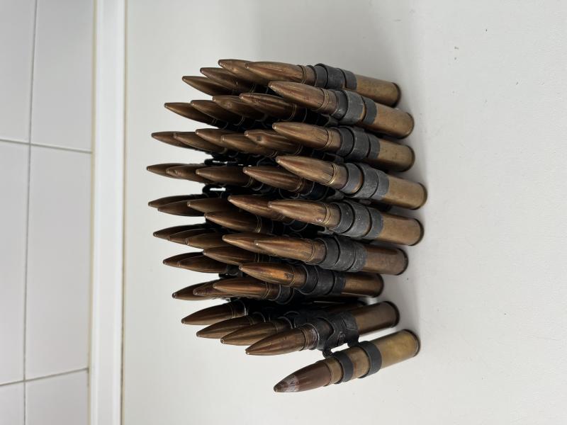 Buenas, vendo cinta de munición con 42 cartuchos inertes calibre 50 o 12,7x99. Muy difícil de conseguir. 160€ + porte por agencia.