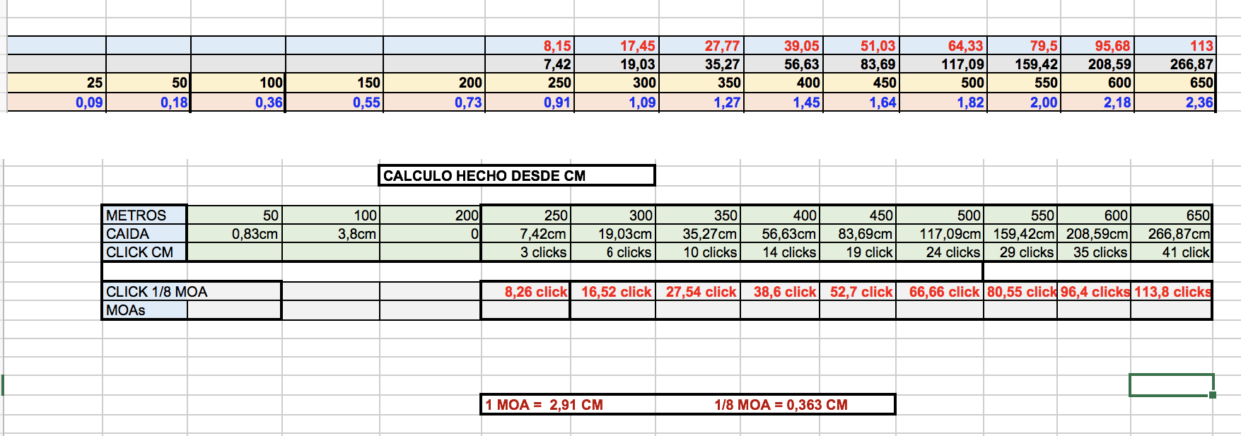 Lo que tomo de esta anterior tabla para pasarlo ahora a MOA son las correcciones en hice antes en cm, el planteamiento bien hecho, no debe de fallar, ya que hay una equivalencia, hablando de puestas de tiro, no de el vuelo en si.
