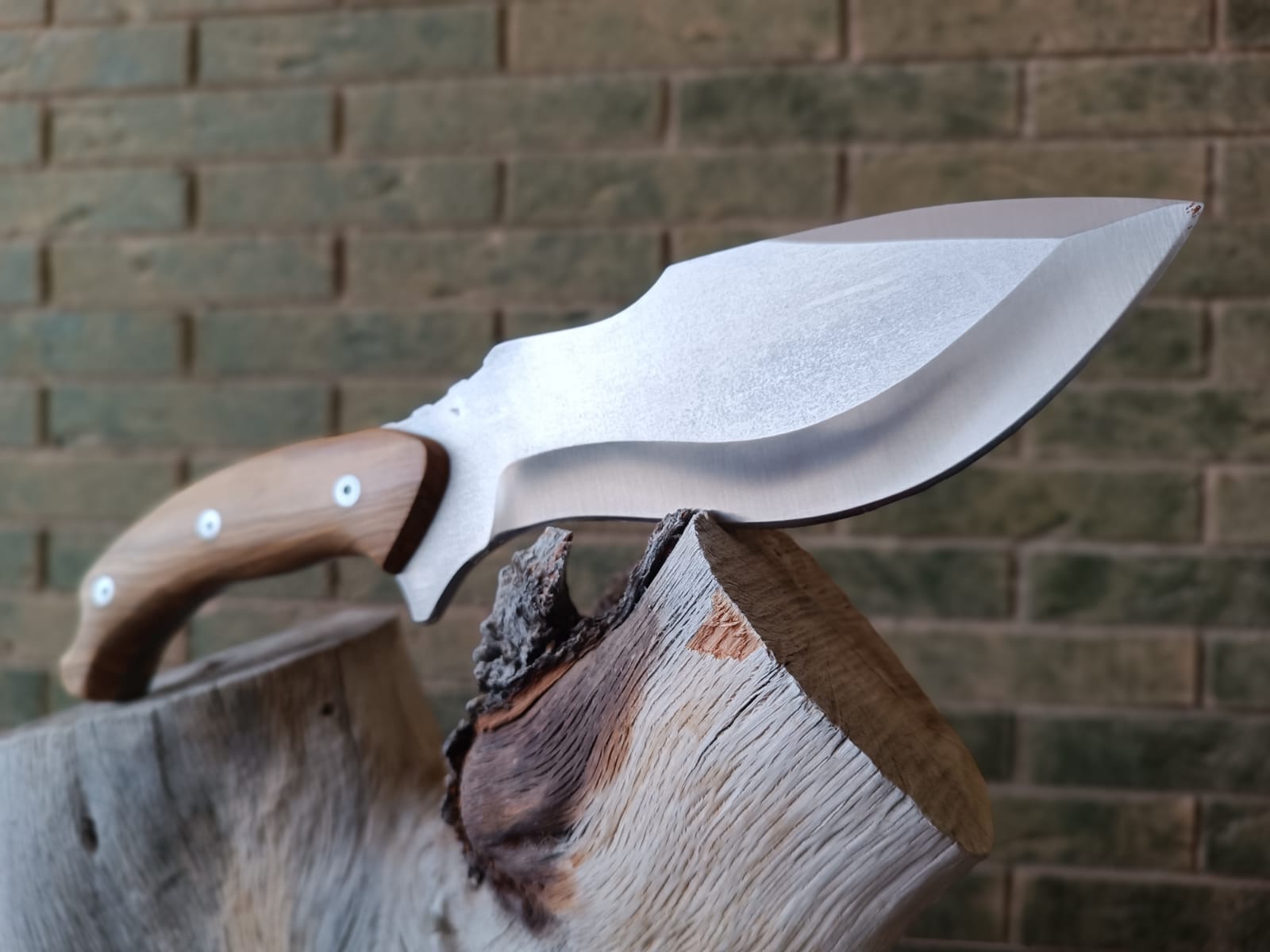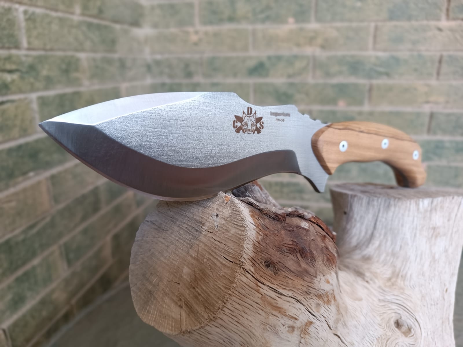 Contundente cuchillo de monte o supervivencia. Hecho a mano, con encabado en madera de olivo.