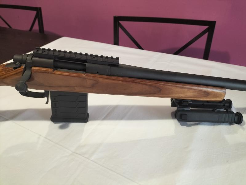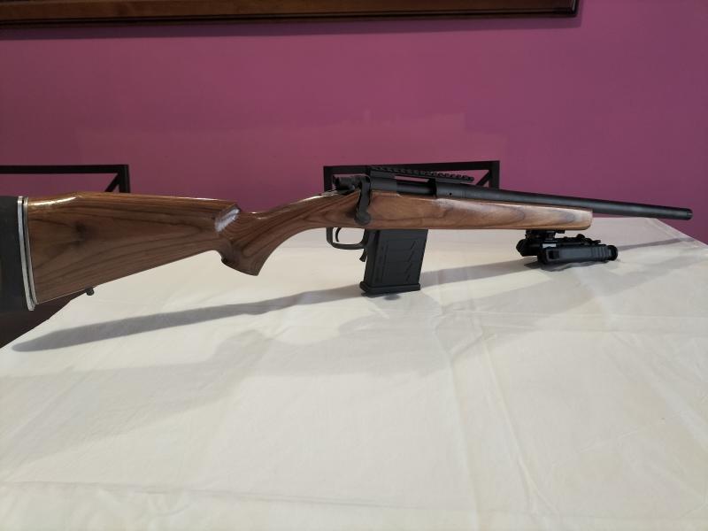 Rosca cañon homologada, cañon 50 cm. ,cargador MDT extraible de 10 cartuchos, culata pesada de madera y disparador afinado por armero.