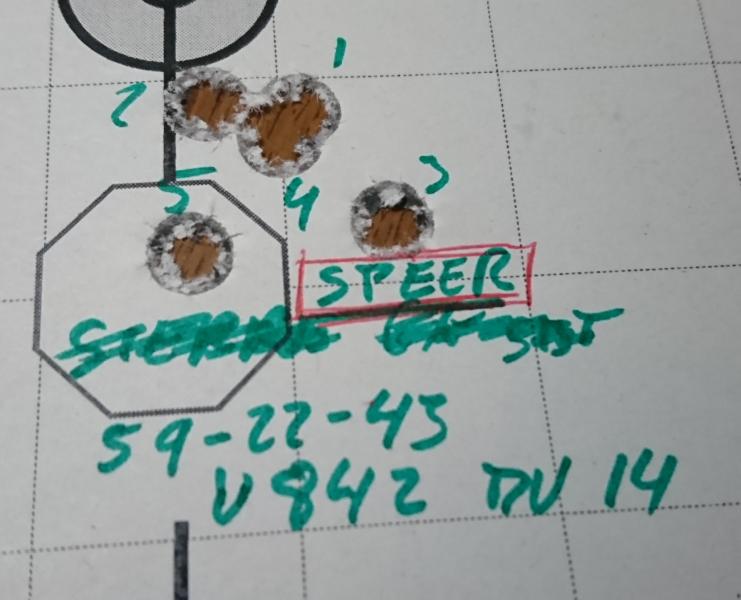 En la diana hay 7 (5+2) disparos, primero 5 disparos, los enumere, y segui haciendo pruebas con la Speer, despues de varias tandas, volvi a disparar dos cartuchos volviendo a entrar en el grupo quiero pensar que son el mas alto y el de la derecha, ya que falta la anotacion 2, se adivina algo rojo y el 4 esta tocado.