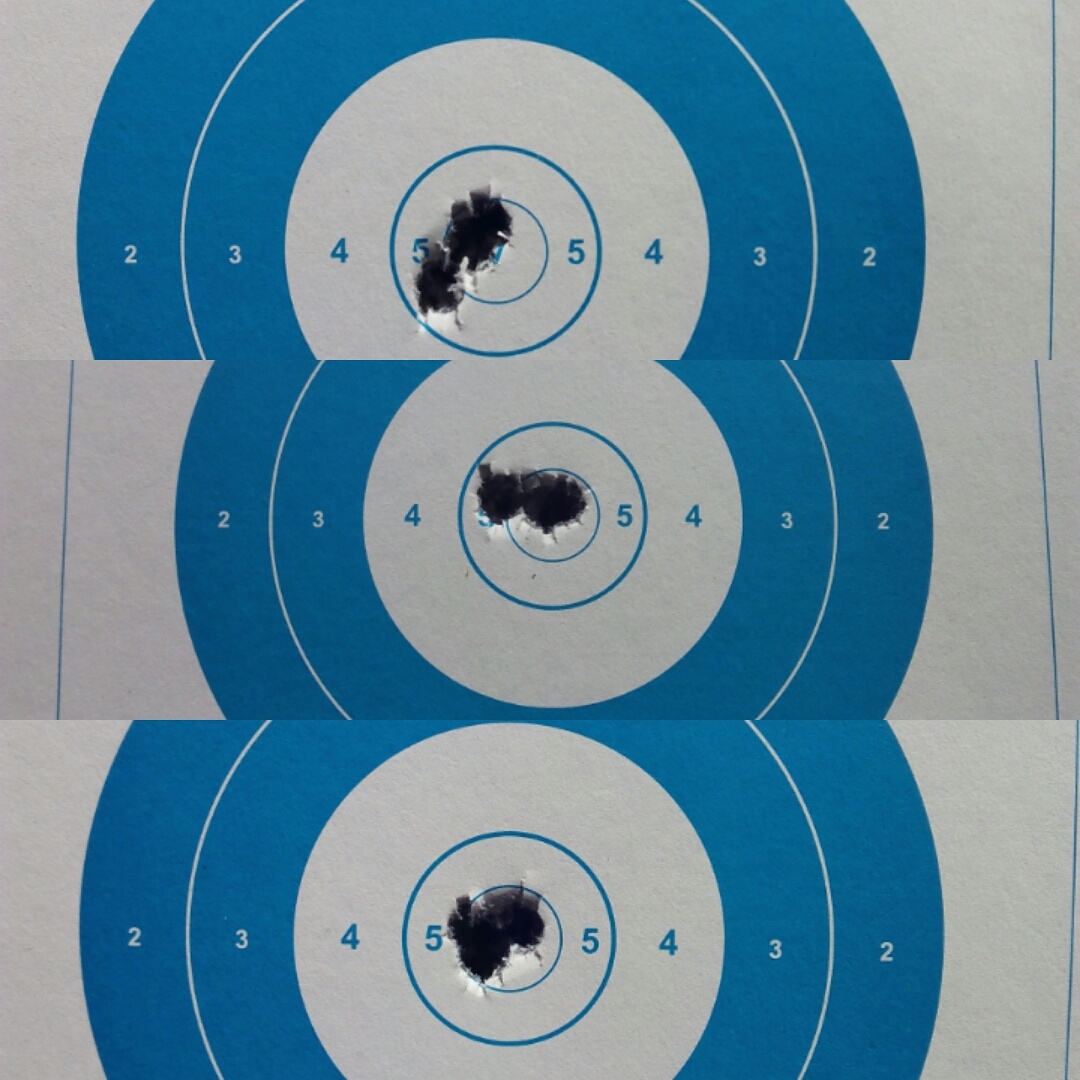 Respecto a hacer series de cinco creo que, mientras no aclares y corrijas eso del tiro errático, es una pérdida de tiempo y dinero, ya que ese tiro es el que te está desbaratando el tema, si lo que buscas es conseguir las agrupaciones a las que te has referido.