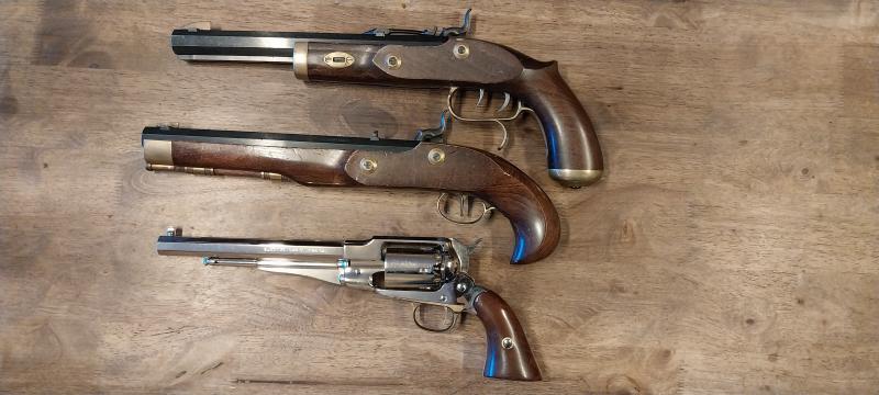 Vendo revolver pietta inoxidable, con algún toque estético pero mecánicamente perfecto. Según recuerdo tira bajo pero centrado. Subo foto de las chimeneas desmontadas. Le acompañan dos pistolas que necesitan una restauración profunda. Una de ellas tiene una bola metida (sin polvora). Las compré ya así y no me ha dado tiempo de arreglarlas. Me quitto toda la avancarga.