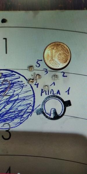 Sin calentar ni dianas previas, la primera que hice a esa distancia. Antes habia pegado 4 tiros a 50m para calentar el muelle y comprobar el cero.