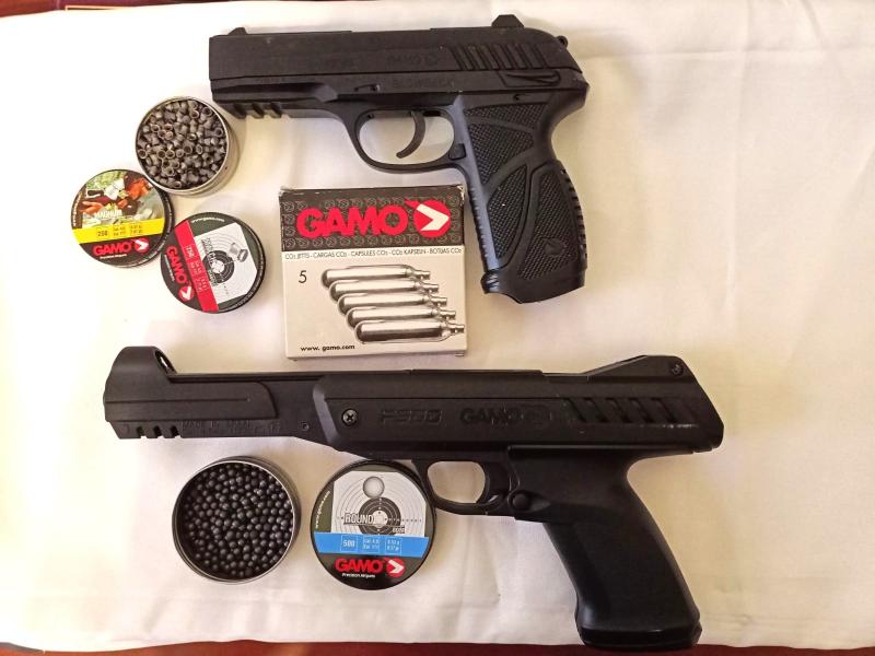 La familia de un amigo recientemente fallecido ha puesto a la venta estas pistolas Gamo, una de muelle y otra de CO2. Se incluyen balines y 4 cargas de CO2.