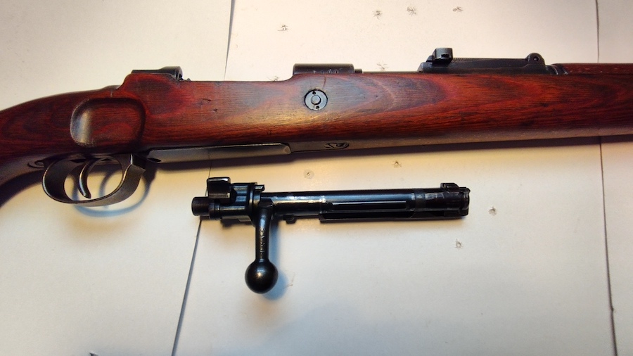 La numeración es coincidente en todas sus piezas. El calibre es el afamado 8x57 Mauser, o también llamado 7,92mm Mauser. Cómo veis, el cerrojo está curvado, por lo que admitiría montaje de visor telescópico. El estado general es bueno, como se puede apreciar en las fotos. el pavón está casi al 100%. Disparador suave pero no manipulado. El cierre del cerrojo es impecable, sin holguras.