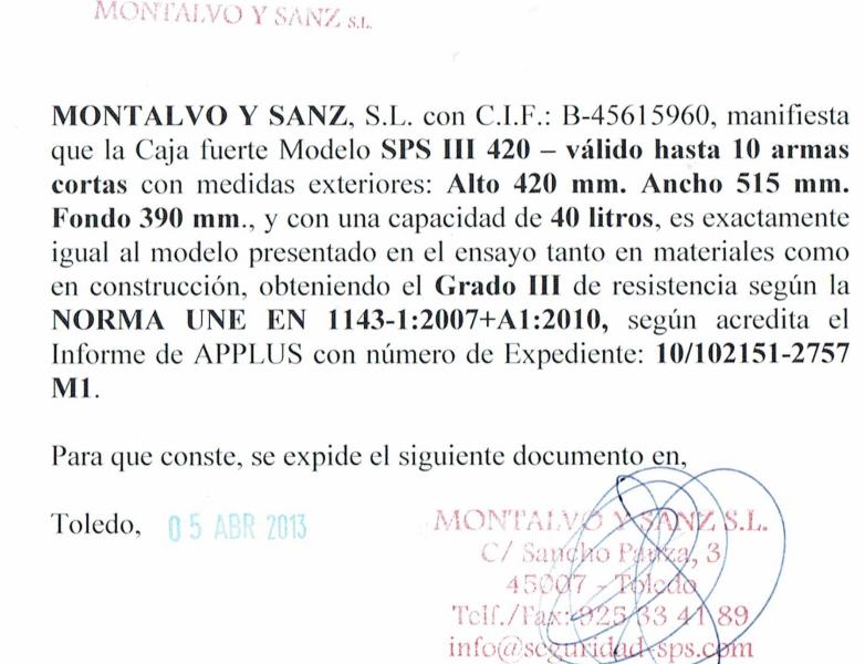 Opino que la norma EN 1143-1 no autoriza a certificar el número de armas que caben en un armero. Esa norma solo se refiere a los métodos de ensayo. El fabricante solo puede certificar la dimensiones exteriores e interiores.