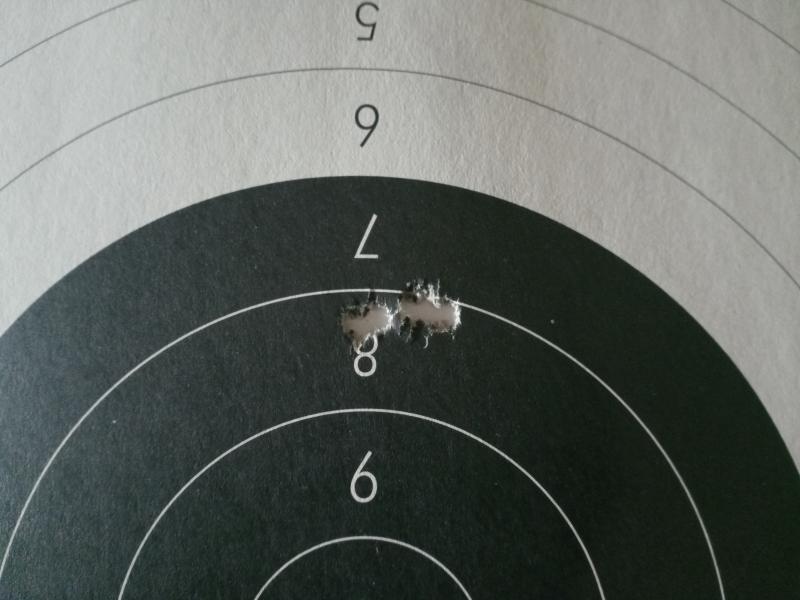 La de los seis impactos es a 200 m y se caracteriza porque los tres tiros más bajos han sido con la carga descrita y los tres altos y un poco a la izquierda es la misma carga pero con pistón Fiocchi. Me parece que a 200 ha jugado un poco el paralaje.