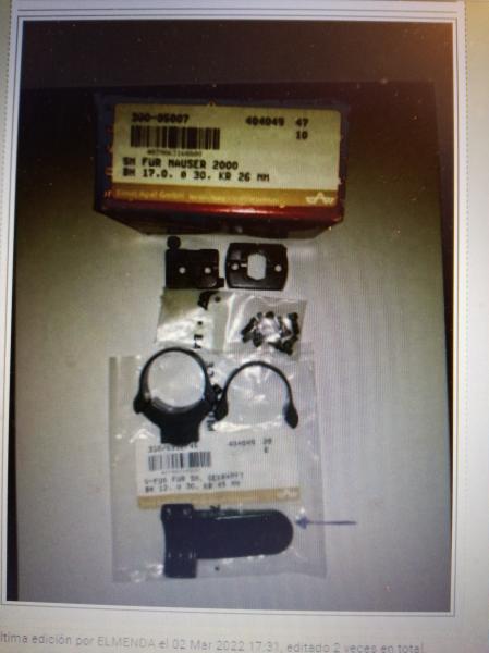 Vendo unas monturas APEL ORIGINALES (completas + otras anillas) para MAUSER o acciones 98 ( Santa barbara. Voere, etc) de baja altura y para tubo de 30, con dos anillas con base (pie) delantera (corto y largo), el pie corto está impecable y señalo que el pie delantero largo tiene un pequeño rebaje ( pavonado) ya que me tocaba la campana del visor, se señala con la flecha en la foto, por lo demás están impecables.