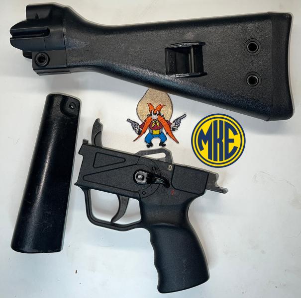 Ejemplo de piezas de polímero suministradas por MKE: culata, guardamanos y lower , fabricados con acabados y texturas menos refinados. Esta imagen ilustra el aspecto más basto de los polímeros turcos frente a las piezas HK o B&T.