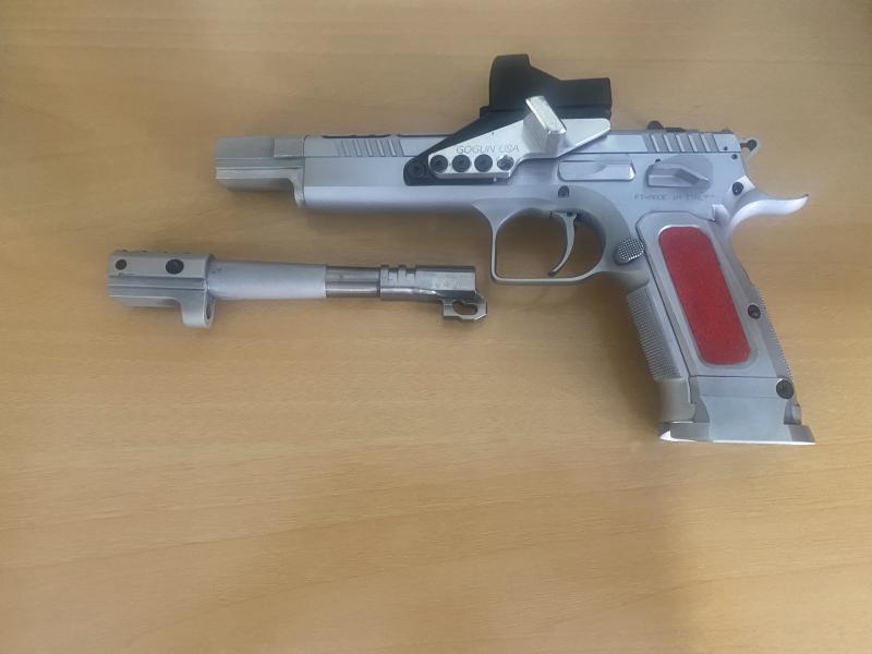 Tanfoglio Open caño del 38 y 9 el del 9 llevará 2000 tiros y el del 38 400 tiros escasos está impecable gatillo afinado, varios repuestos tiradores y retén corredera nuevos y algún muelle 4 cargadores y funda Todo 2000€ no vendo nada por separado