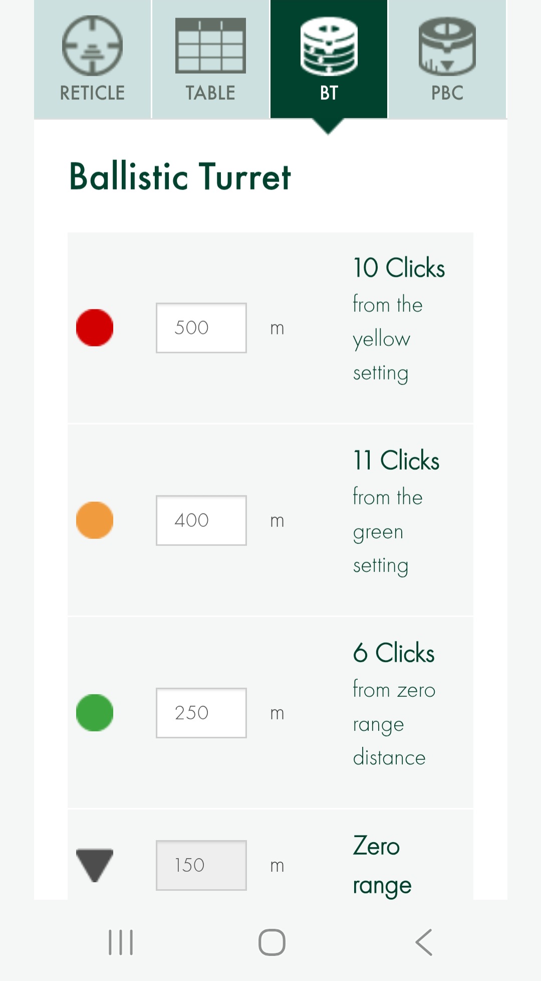 En el calculador de Swarovski puedes indicar tanto la distancia del 0 como las diferentes distancias de cada punto de la torreta.