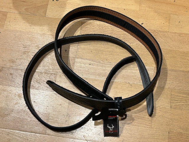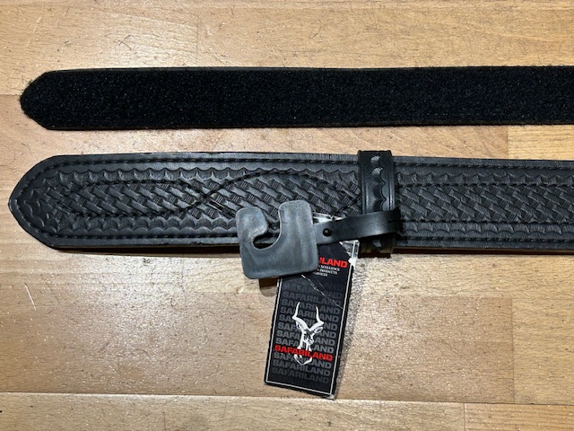 Cinturón Safariland sin usar, Sirve para IPSC o para el servicio. Se compone de cinturón interior con velcro que se sitúa en el pantalón y tiene unas dimensiones de 3,8 centímetros de ancho y 135 de largo, y cinturón exterior de cuero en tono negro que, con unas dimensiones de 5,8 cm de ancho y 135 de largo, se sitúa sobre el anterior gracias a un velcro interior.