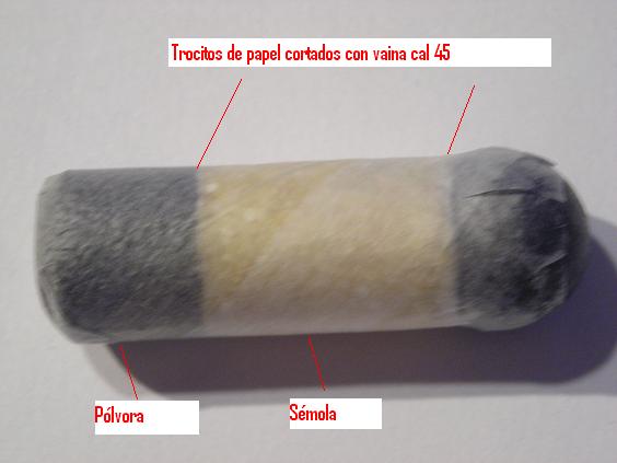 Lo que más me preocupaba es la parte del cartucho que da con la chimenea, quería que el contacto por esta parte fuese lo más directo posible. De hecho solo está en contacto una capa de papel sin ninguna doblez para evitar un fallo de encendido de la pólvora. Ya sé que vosotros habéis tirado con cartuchos con dobleces por los dos extremos y os ha ido bien, por lo que he leído en el foro, pero como me gusta hacer cosas nuevas y que queden a mi gusto, pues lo he hecho así. En la foto el cartucho esta relleno solo de sémola pero la idea es colocar entre la pólvora y el proyectil dos tacos de fieltro el más próximo a la pólvora sin engrasar y entre medias un trozo de papel aluminio para evitar que la grasa impregne el primer taco. Estos irán pegados con pegamento para papel, de barra, de los que utilizan los niños en el colegio. También he pensado hacer unos pequeños orificios con un alfiler en la parte del cartucho que está en contacto con la chimenea son lo suficientemente pequeños para evitar que la pólvora se salga por ellos y me imagino que facilitará el trabajo al fulminante. El único inconveniente que le veo es que te tiras por lo menos dos minutos en hacer cada cartucho.