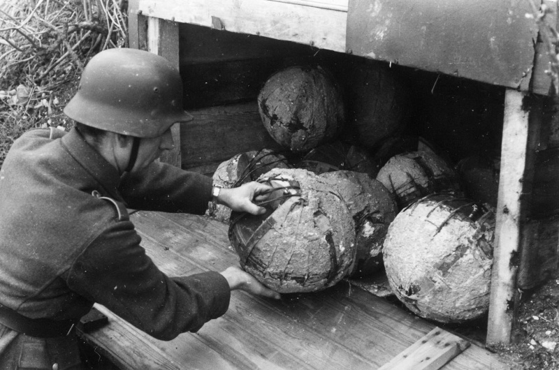 Es una mina teller modelo 35 alemana convertida en una bomba rodante, se le elimina el mecanismo de presion y el tubo que se observa es el sistema de mecha lenta o de retardo ZDSCHN. ANZ. 29 , se le hacia un encofrado de cemento de alguna clase y eso le daba un peso aproximado de 19 kgs y un diametro de 33 a 34 cm creo no estoy muy seguro que la llamaban Kugel-Treibmine , se hacian rodar por unas rampas cuesta abajo en direccion a las playas desde los refugios alemanes y boooomm , :D :D que ingenio, las fotos son de una descubierta en el sector de Arromanches por unos arqueologos franceses.