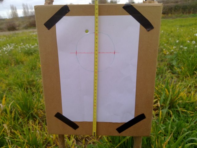 Me dispongo a realizar un primer disparo con la bala semimetálica. Decido apuntar al mismo sitio que con la metálica pues de esa manera sabría la caída que tendría.