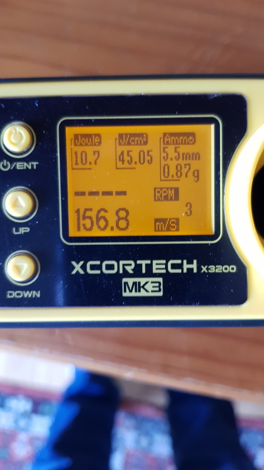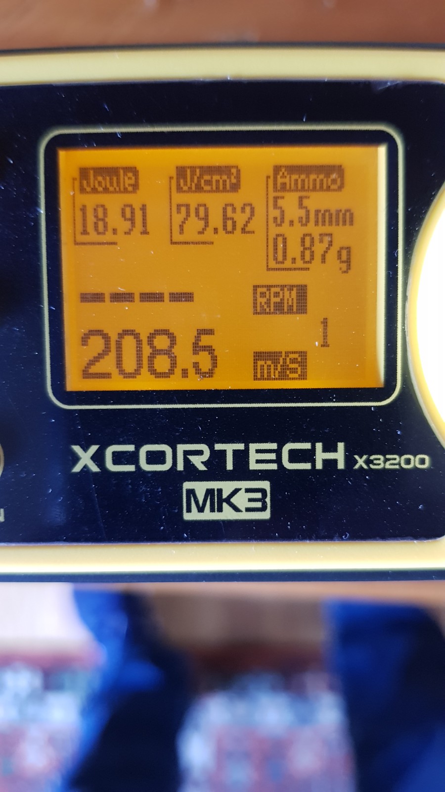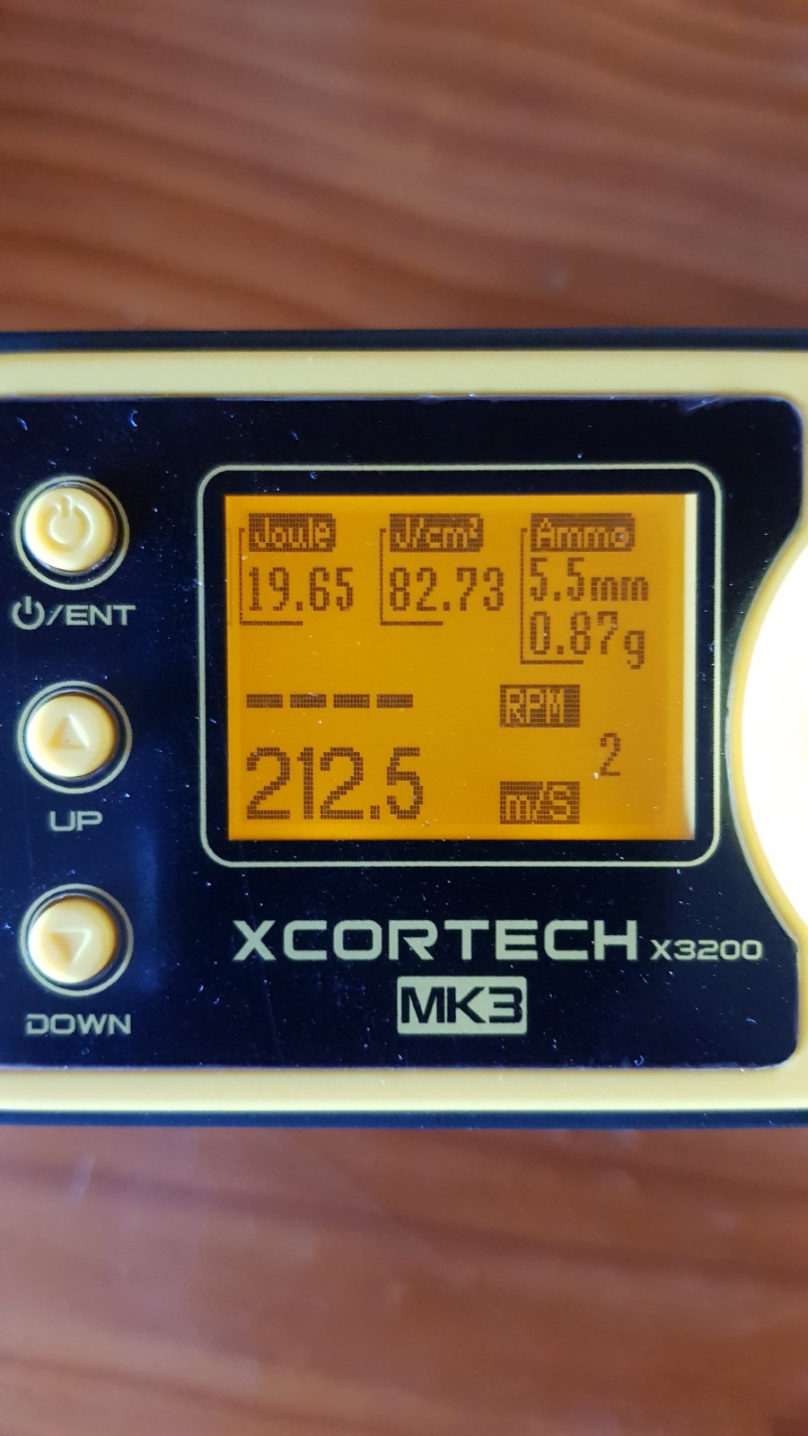 Hola, se ve que no es muy popular la realización de esta idea que se me ocurrió, aunque ya estoy dudando entre eso o bajar la potencia a la SPA CP1 calibre 5.5, pues después de hacerle múltiples mediciones he observado que en el disparo 28 ya comenzó a caer un par de cm y el disparo 30 ya se iba a casi 10 cm abajo, los balines usados son H&N sport de 0,87 gramos. Lo sorprendente fue la potencia que ofreció en el inicio de la capsula de co2 recién puesta, en el primer tiro leyó una potencia de 18,91 julios y una velocidad de 208,5 m/s, tuve que medir la potencia del segundo tiro para eliminar la duda de mal funcionamiento del cronógrafo, y no solo dio la del primero sino que la superó un poco 19,65 julios y una velocidad de 212,5 m/s, en el tercer disparo la potencia ya bajó a un nivel mas cercano a lo normal 10,7 julios y 156,8 m/s , el cuarto disparo 10,22 julios y 153.2 m/s , y en el quinto la lectura fue de 10,68 julios y 156,7 m/s , estuve casi cinco minutos sin tirar y tomé la sexta lectura 13,12 julios y 174,7 m/s , esto ya me dio la vuelta las neuronas y ya dejé de hacer mediciones, así que ¿como va a durar la botella de co2 más de 30 disparos con la potencia que se gasta esta CP1?. Tengo las fotos que hice para mostrárselas a un compañero de tiro, pues imaginé que no me creería :lol: , Inserto las fotos como ilustración del post