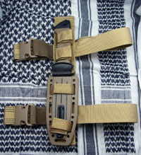 Por lo que respecta a su hoja, el cuchillo Gerber LMF II A.S.E.K. cuenta con una hoja de 12,3 cm de largo, un tamaño suficiente como para realizar las funciones básicas de cualquier arma blanca militar. Está fabricada en acero inoxidable Sandvik 12C27, y presenta un diseño ligeramente aserrado, con una punta con un falso filo muy útil para facilitar que la hoja se clave y penetre cómodamente casi sobre cualquier superficie. Para mantenerla en todo momento en perfecto estado de uso, el LMF II A.S.E.K. se comercializa junto con un afilador que puede guardarse en un pequeño bolsillo incluido en su funda de transporte. Y es que esta funda es uno de los elementos más destacados de este cuchillo de combate, ya que además de ofrecer un alojamiento idóneo y completamente seguro para portar el cuchillo y sus accesorios, también resulta de lo más útil y versátil.