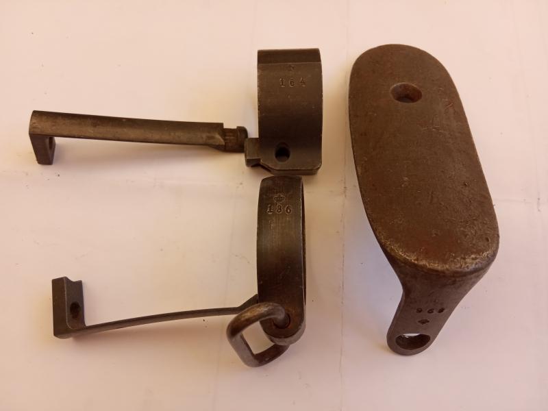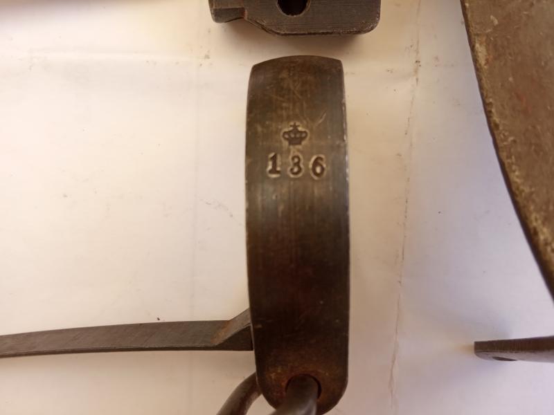 Cantonera, abrazadera anterior, segunda abrazadera y sus flejes, uno mas alto que el otro como corresponde, material original usado, numeración no coincidente, 40 euros.