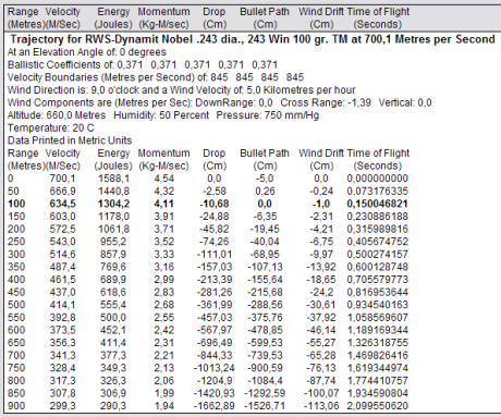 Eso es muy interesante. Tan sólo añadir que si el programa lo permite se podría incluir el dato de la altitud a la que va a tirar cardhu, ya que a cierta altitud una bala de 90-100 grs desde un cartucho como el .243 te puede ganar algún cmt en, digamos, 200 mts con respecto al nivel del mar. Observo que las tablas dan esos datos para 660 mts, 50% de humedad, 750 mm de presión y 20ºC. El dominio de esas variables ayuda mucho a tirar bien.