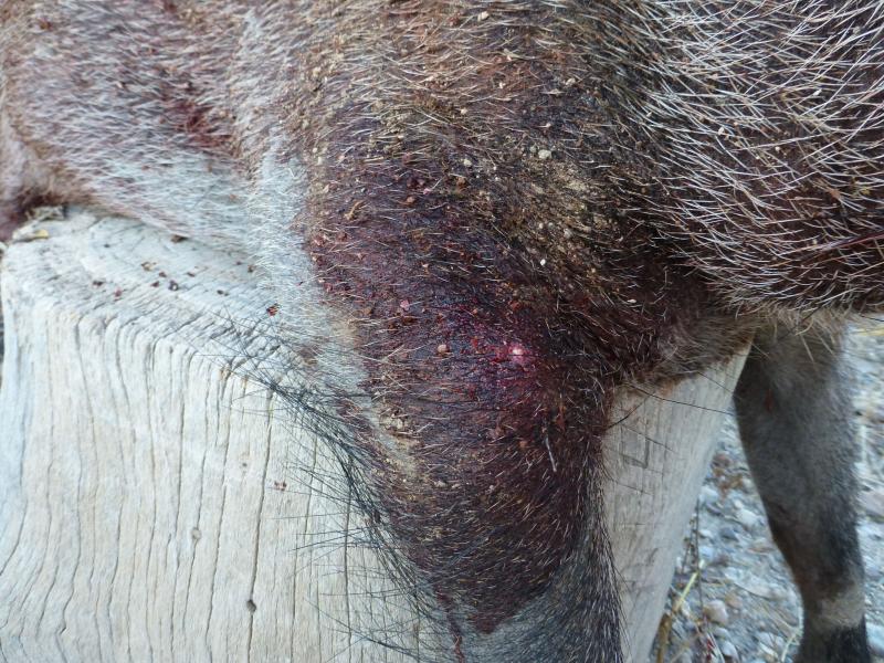 Fue un tiro un poco angulado y ambos tiros fueron en el lado derecho del animal,la hendidura que ves la provocó el primer tiro ya que la jabalina estaba algo cruzada sin ofrecerme todo su perfil,esa bala se quedo atascada en la columna vertebral sin salir por el otro costado.