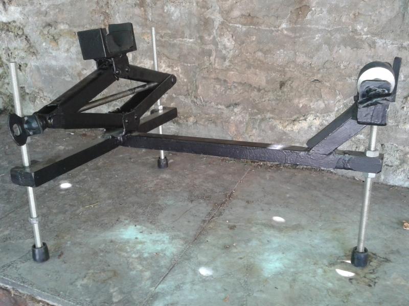 Pues este es el mio. Por unos treinta euros en materiales y un amigo con una maquina de soldar. Yo creo que es importante el peso, el mio pesa unos 25 kilos y eso hace que que a la hora de mover las torretas del visor apuntado ni se mueva. El sistema de las patas esta pensado para poder tirar desde una mesa o cualquier sitio irregular como el capo de un coche. Las patas se pueden anclar a una mesa metálica, pero me gusta mas como esta en las fotos pues mas manejable.