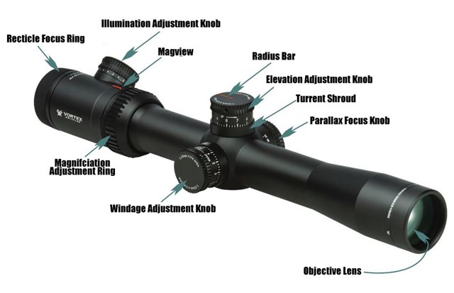 El corrector de paralaje, en visores modernos, si es necesario, fundamental, para enfocar perfectamente la imagen dependiendo de la distancia a la que esta el objeto, si no, lo verías borroso, y suele ser, la torreta del lado izquierdo. Algo totalmente necesario, y que quizás muchos no saben, es el corrector de dioptrias, en la foto "reticle focus ring", que está en el anillo del ocular, atrás del todo. Puesto que no todos vemos igual, es necesario enfocarlo a máximos aumentos contra una pared blanca, y girarlo hasta ver perfectamente nitida la retícula, y dejarlo fijo ahí, y regulado para nuestra vista en particular. Eso mal regulado, puede dar errores de puntería......