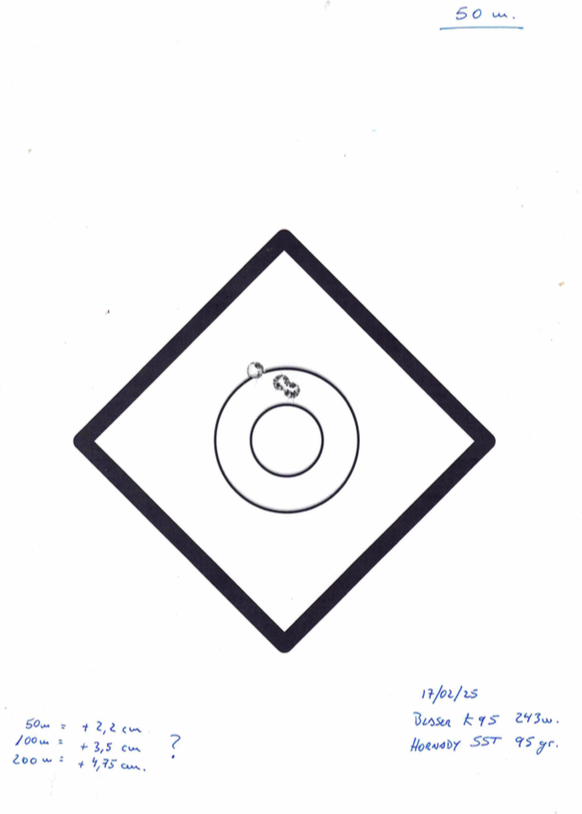 Tirando con un 243, cartuchos comerciales Hornady SST SP 95gr., tiros a 50m., 100m. y 200m. Adjunto imagen de la diana a 50 metros, en esta agrupa por encima del 0 unos 2,2 cm. A 100 metros unos 3,5 cm por encima. y a 200 metros unos 4,75 cm por encima.