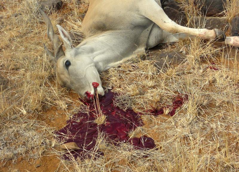 Le tiré a un Eland, de unos 800 kg., a 150 m. al pecho, aún trotó de mala manera unos 20 m. ó 30 m. antes de volcar. Ni dí un paso ni hice intención de volverle a tirar. Para mucho.
