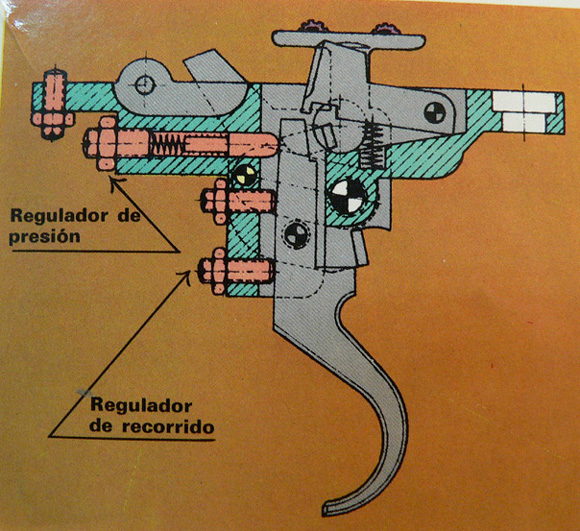 El horizontal de abajo (en la imagen marcado como "regulador de recorrido") es el de la suelta o también llamado segundo tiempo (segundo tiempo en los disparadores de dos tiempos). Este al apretarlo lo que va es moviendo la cola del disparador hacia atrás disminuyendo la superficie de enganche entre los fiadores.