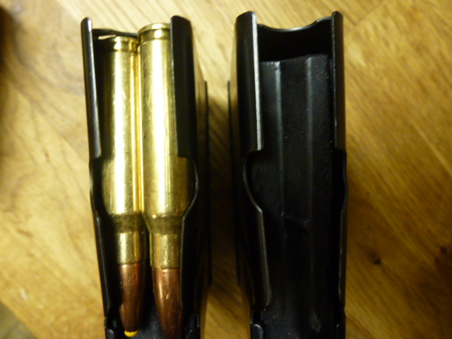 El principal problema es que quedan los cartuchos retrasados en el cargador y la corredera no los arrastra a la recámara (ver fotos anteriores) y al ponerles una placa detrás, no caben los 10 cartuchos porque queda la leva atrapada en el interior del cargador.
