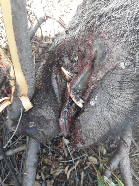 Veo que no se observa muy bien, pero estaba lleno de larvas. Al lado del colmillo se puede ver una mosca.