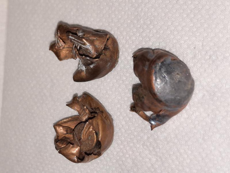 Su punto débil es la alta velocidad en tiros hasta los 100m. Diria que todos aquellos impactos a mas de 800m/seg. Como se ve en las fotos del compañero, varios proyectiles ya han perdido la camisa, y otros están a punto de expandir hasta la misma base del proyectil. Yo también conservo algunos en ese mismo estado. Esa deformación en la dura coraza de un buen jabalí, nos puede costar cara.