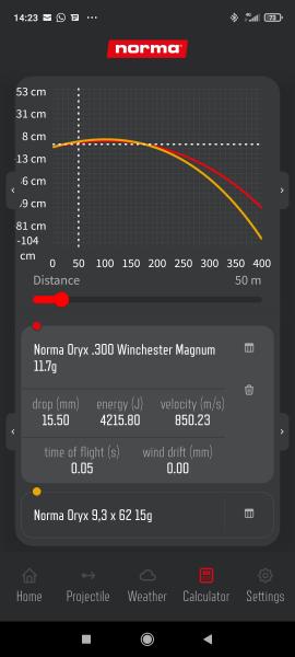 Entiendo que quién esté acostumbrado al 300 WM mire al gordito con un poco de suspicacia pero si compara dos cargas del mismo fabricante (Ej. La Oryx de Norma en los pesos mencionados arriba) observará que el gordito, a 50 metros, supera en energía al 300 con una capacidad de ceder está superior por su mayor masa y sección y tan solo necesita 1centésima de segundo más de tiempo para alcanzar esa distancia. A partir de ahí la velocidad y mejor coeficiente balístico juegan a favor del 300 pero siempre sin grandes diferencias. A 100 metros el 9,3 va por debajo en 100 julios pero se mantiene la centésima de segundo de retraso. A 150 metros la diferencia de energía sube a 400 julios y el retraso a 2 centésimas.
