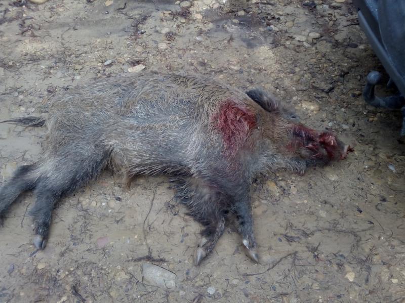 El jueves disparé a un jabalí (foto 1) con un 7x65 R de 177 grains, varios tiros (4) a distancias entre 30 y 100 metros. El resultado fue que el jabalí se marchaba sin acusar ningún impacto, Hasta que localicé un copioso rastro de sangre y el bicho muerto en la maleza a 200 metros. Llevaba un tiro trasero, centrado en altura, antes de los jamones; y otro que le entraba por la boca y salía por debajo de la oreja.