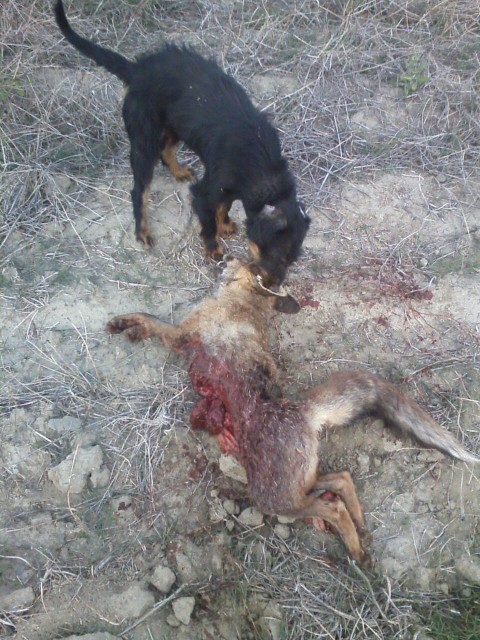 Hoy seguimos con ellas, despues de una mañana de perdices hemos salido a las zorras y han caido tres, dos de los compañeros y nosotros nos hemos pasado mas de dos horas esperando a que salieran las perras que han matado una zorra dentro.