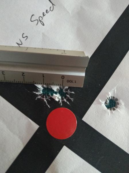 3. RWS Speed Tip 165. Estoy crecido y los dos primeros tiros van al sitio. El tercero noto q se me va un pelín, me costó tirarlo, tuve q recomponer postura varias veces, mucho dolor. En fin, no muy mal pero ese tercero me fastidió el grupo y la mañana, se quedó en 35mm el grupo de 3, después de meter los dos primeros mordidos.