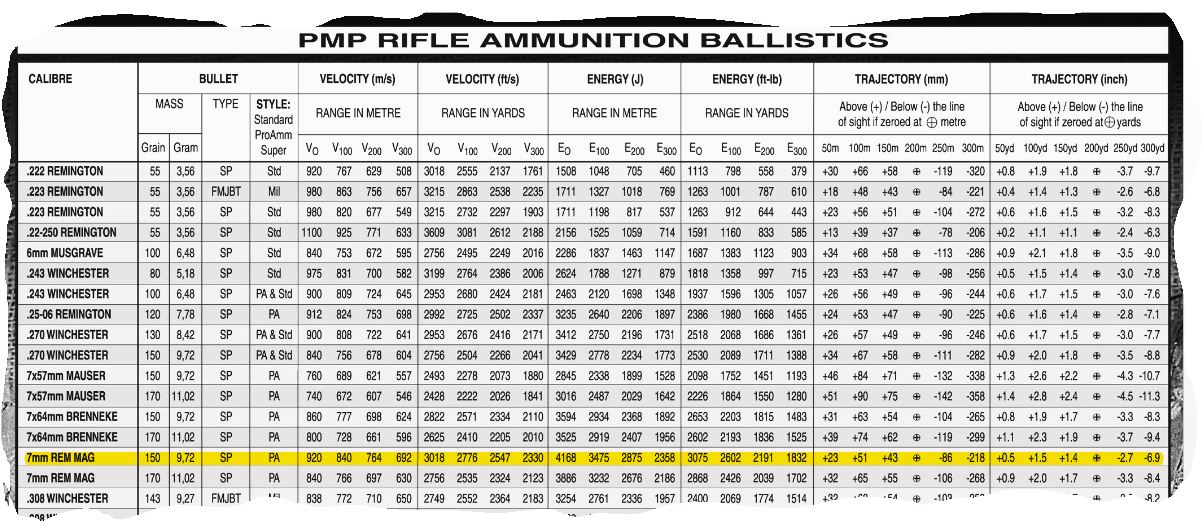 Aquí tenéis la tabla de velocidades de esta marca de cartuchos (Surafricana)